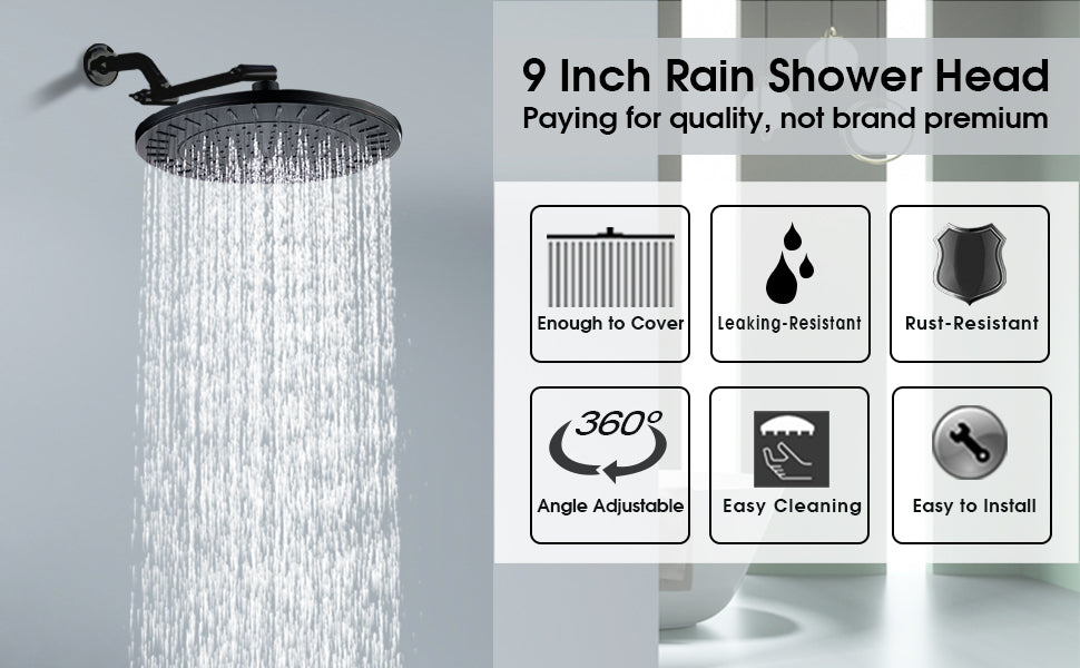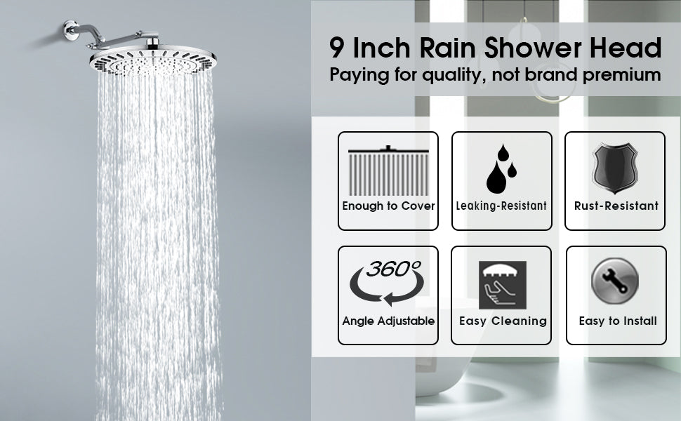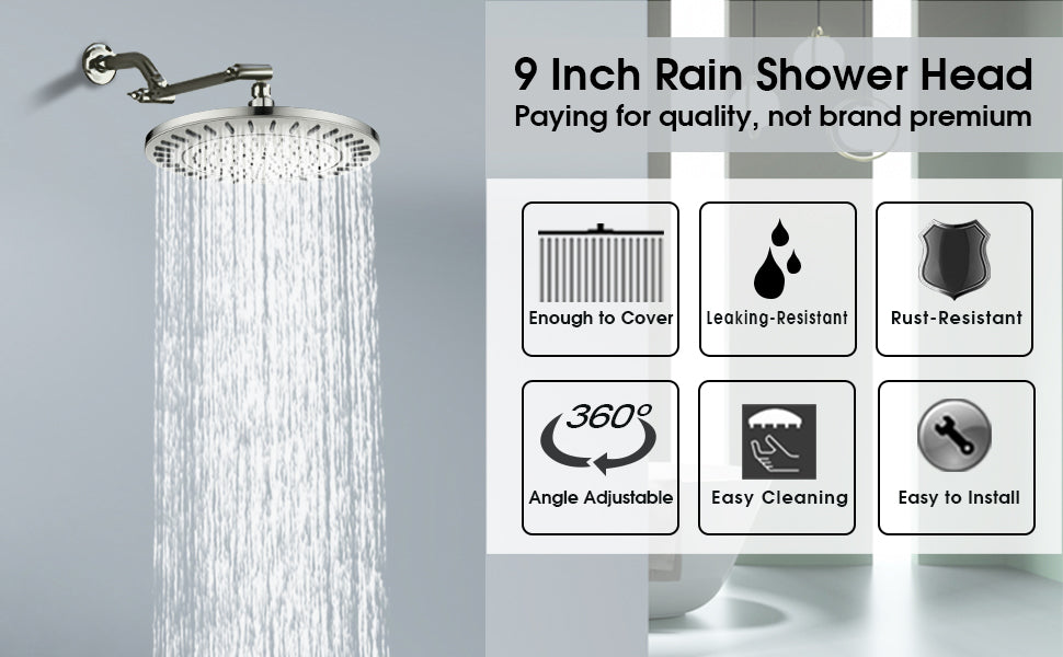 Bright Showers Waterfall Shower Head with Adjustable Angle and Anti-clogging Silicone Nozzles,9 inch